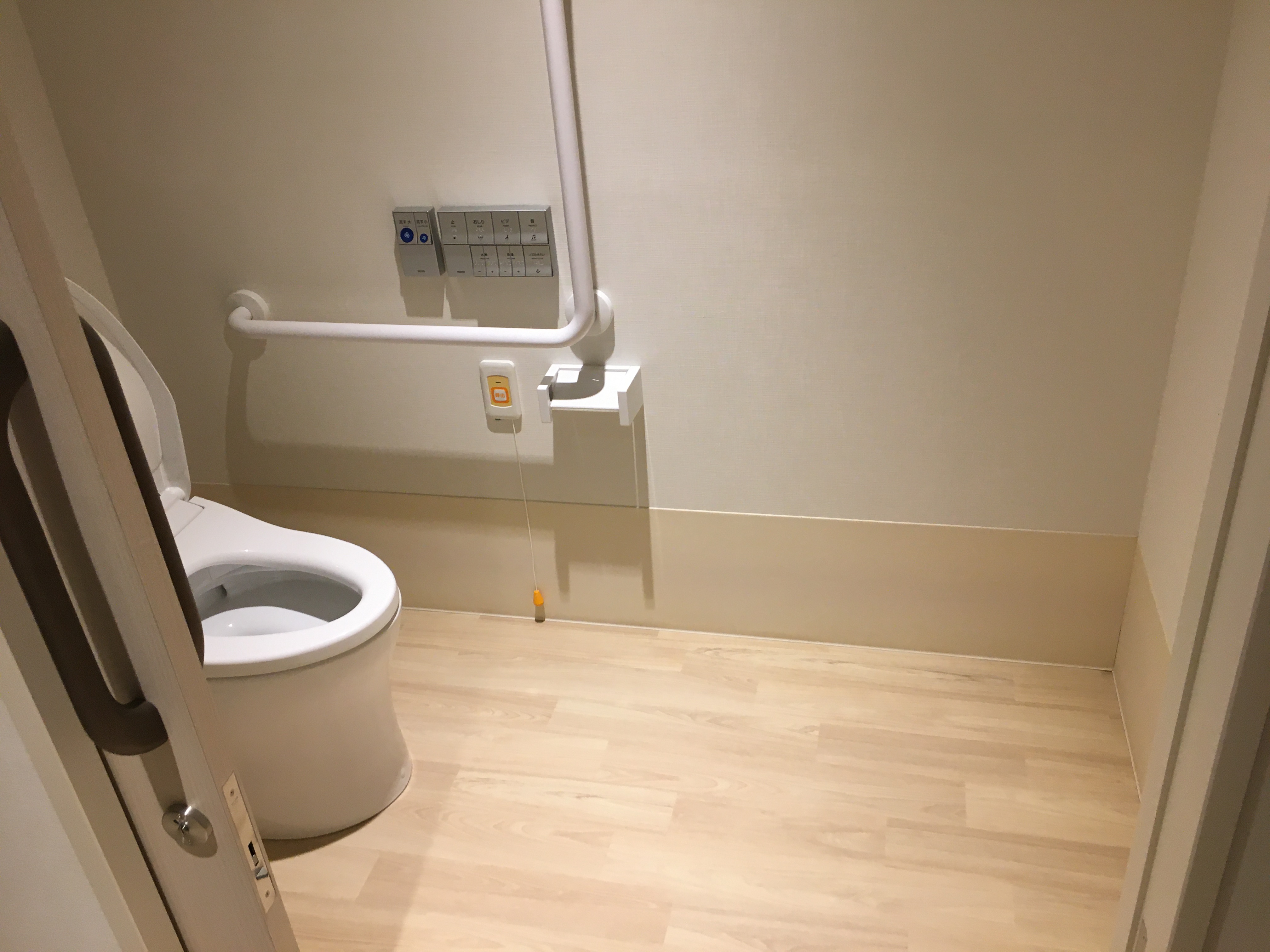 トイレは手すり、ウォシュレットが付いています。車イスの方でも利用できるようにトイレ内は広く作られています。